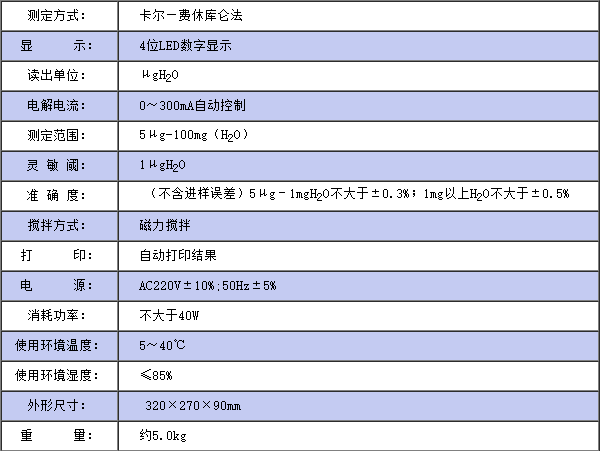 儀器符合GB/T7600;SH/T0246;GB/T606及采用卡爾—費(fèi)休法測定樣品中水分的有關(guān)標(biāo)準(zhǔn)。儀器采用了先進(jìn)的自動控制電路,電解電流自動跟蹤控制,外型結(jié)構(gòu)新穎,從而使該儀器工作更可靠, 使用更方便,具有分析速度快(一分鐘出結(jié)果)、操作簡便、精度高、自動性強(qiáng)等特點(diǎn), 同時具有自動打印功能,可將實(shí)驗(yàn)結(jié)果、做樣時間、樣品編號自動打印出來, 廣泛應(yīng)用于石油、化工、電力、鐵路、環(huán)保等部門。